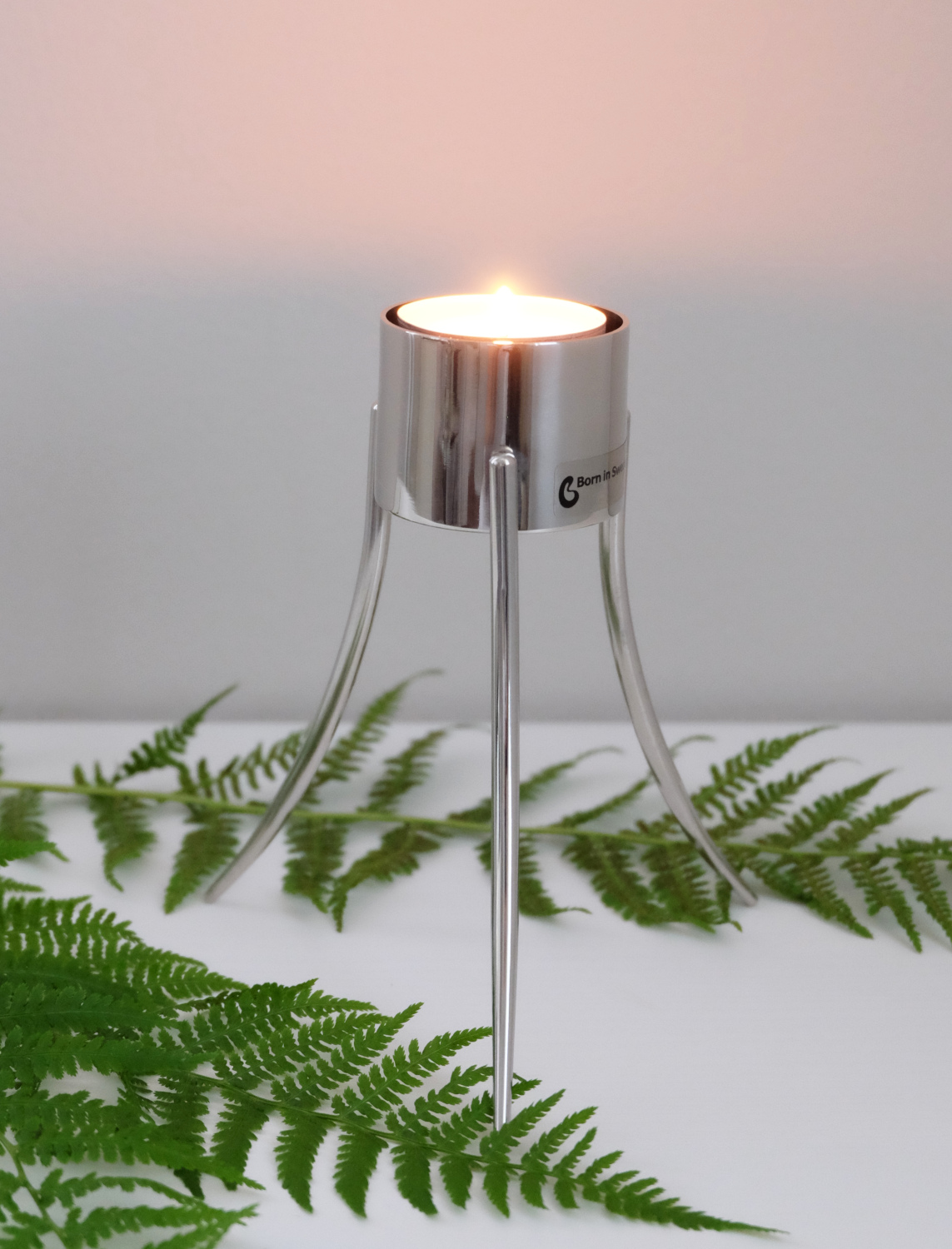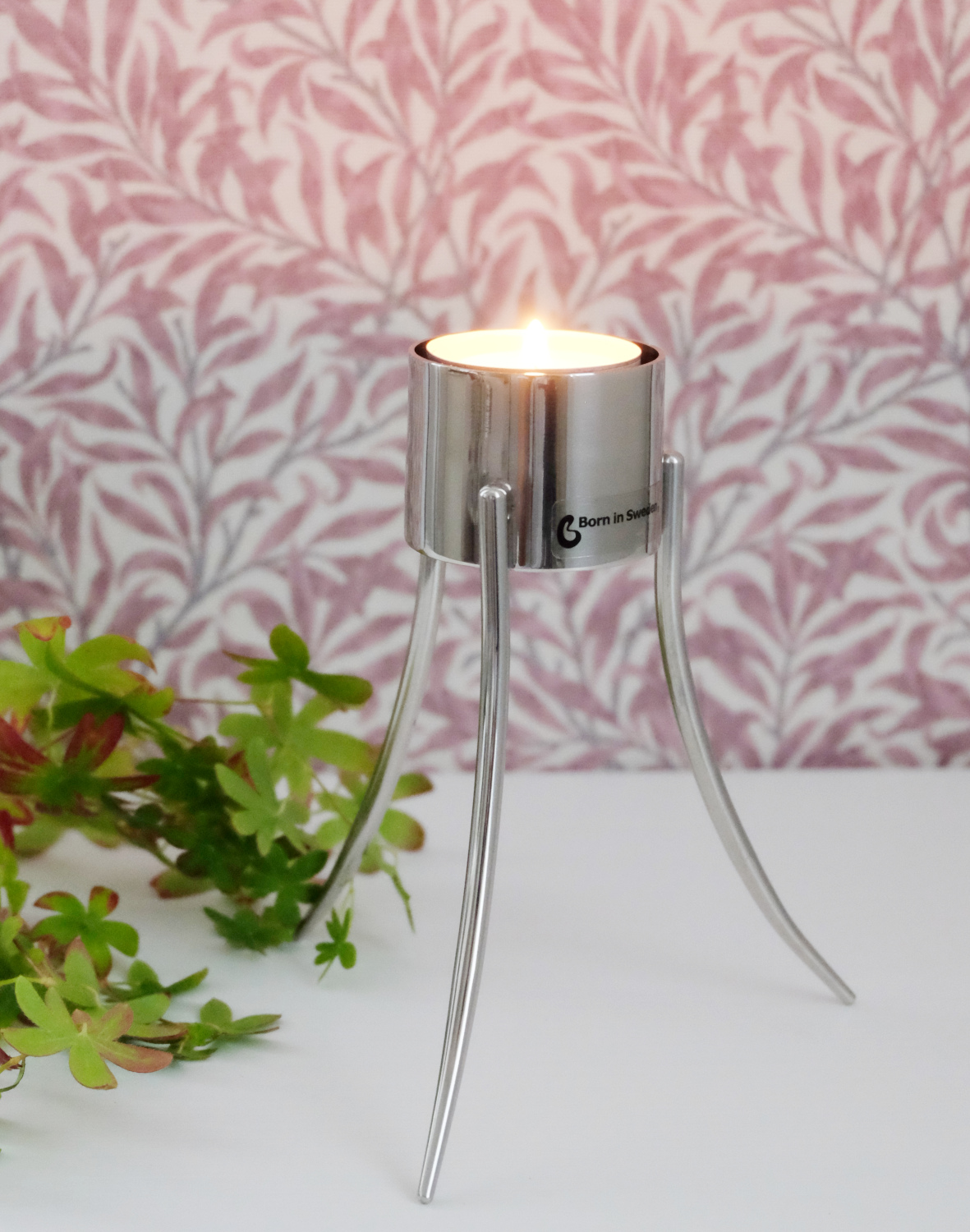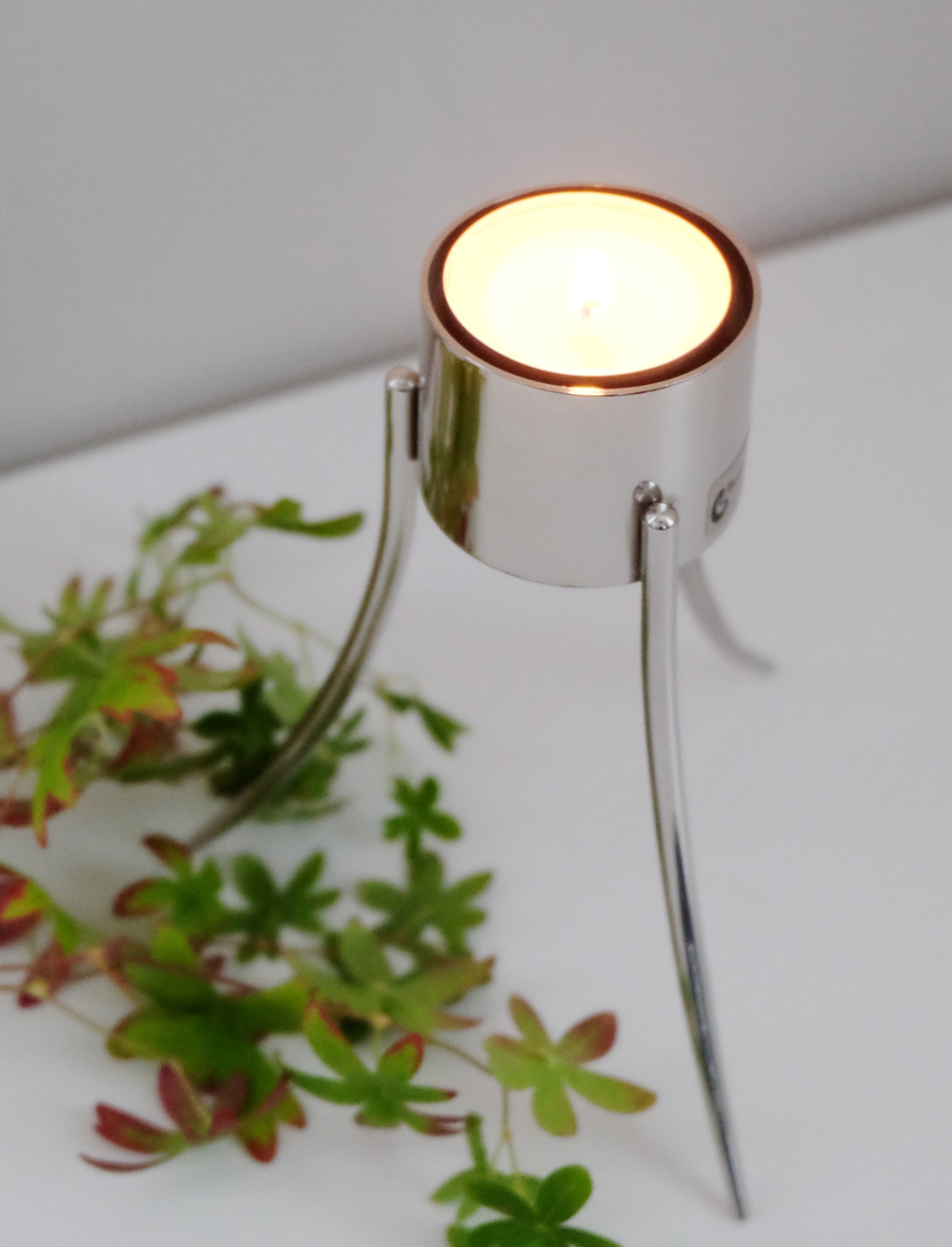 Tyylikäs teräksinen kynttilänjalka, jota voi käyttää kolmella eri tavalla: jaloilla seisten, ylösalasin jalat ylöspäin tai lasissa/maljakossa roikkuen.