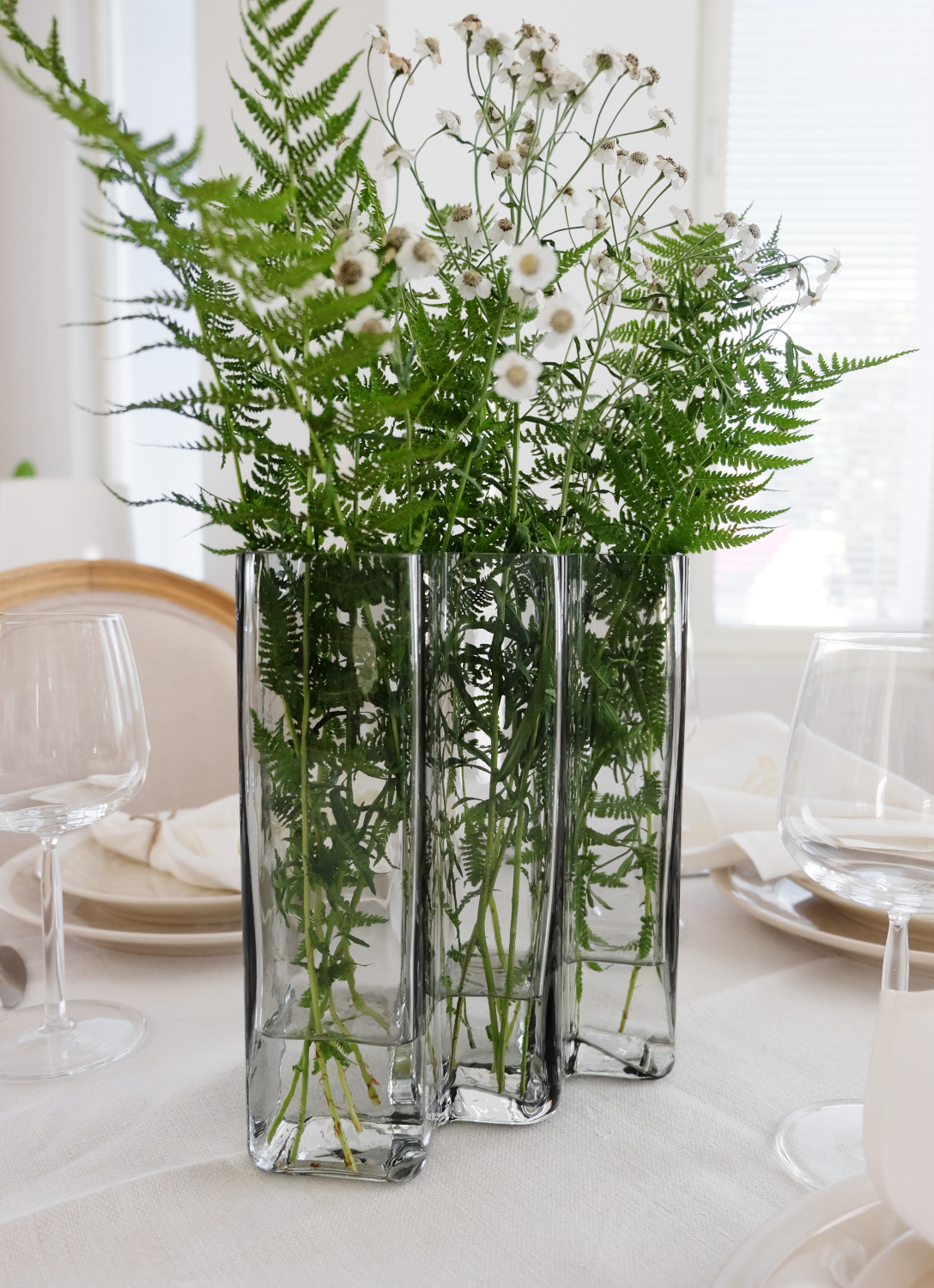 Tyylikäs ja muodoltaan mielenkiintoinen maljakko Row sopii täydellisesti katettuun pöytään kapean muotoilunsa ansiosta. Kukat voi asettaa pöydän keskelle riviin tavallisen suuren kimpun sijaan, jolloin lautasille ja laseille jää runsaasti tilaa.