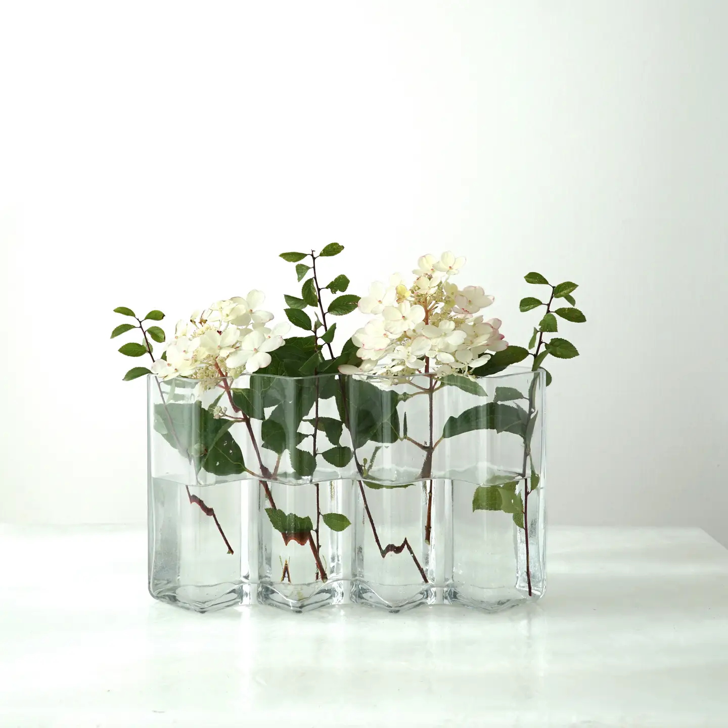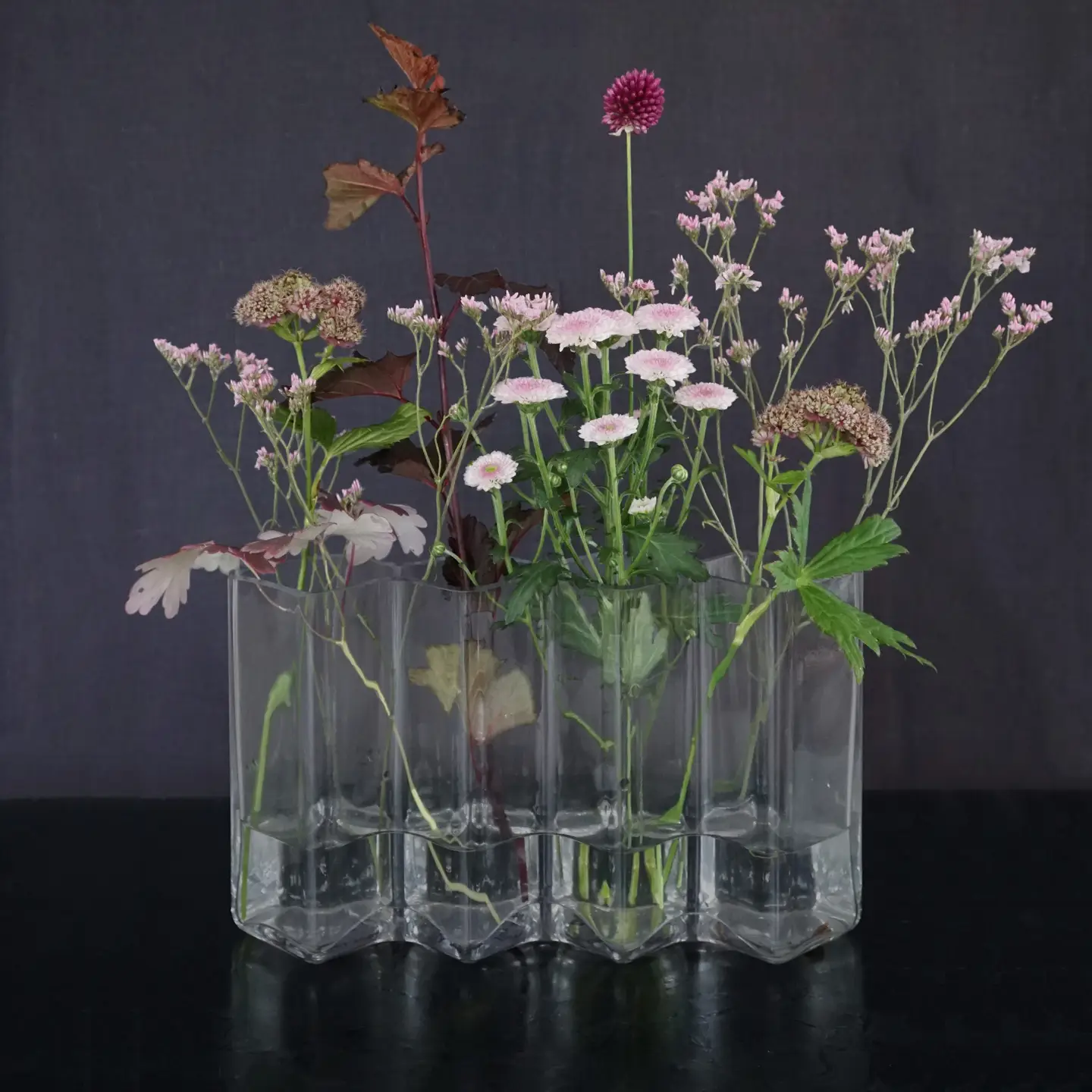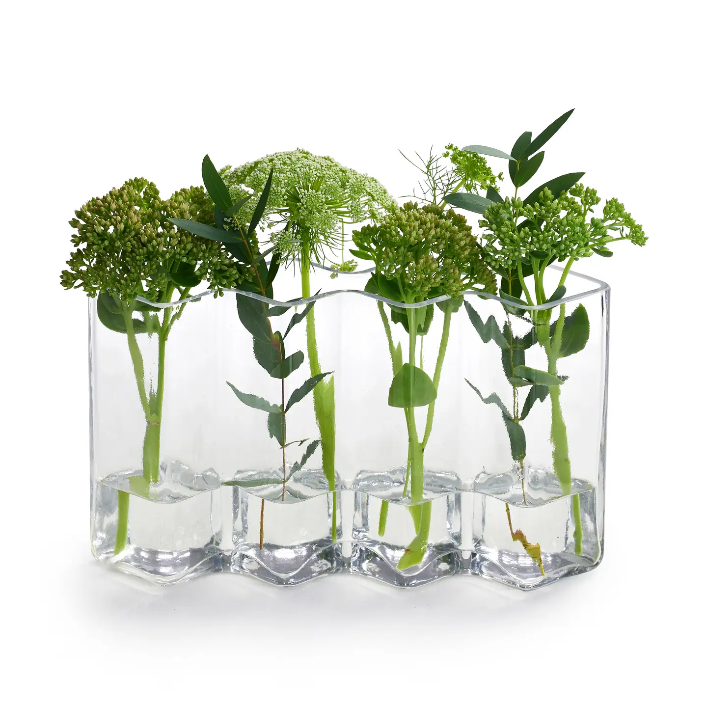Moderni ja muodoltaan mielenkiintoinen maljakko Row sopii täydellisesti kukka-asetelmiin katetulle pöydälle. Kapea muoto mahdollistaa tyylikkäiden kukkarivien luomisen jättäen runsaasti tilaa astioille sekä muille koristeille.